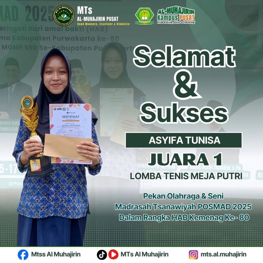 Pada cabang olahraga, Asyifa Tunisa berhasil meraih Juara 1 Lomba Tenis Meja Putri. Dengan permainan yang disiplin, fokus, dan penuh semangat, Asyifa mampu mengungguli para peserta dari berbagai madrasah tsanawiyah se-Kabupaten Purwakarta.