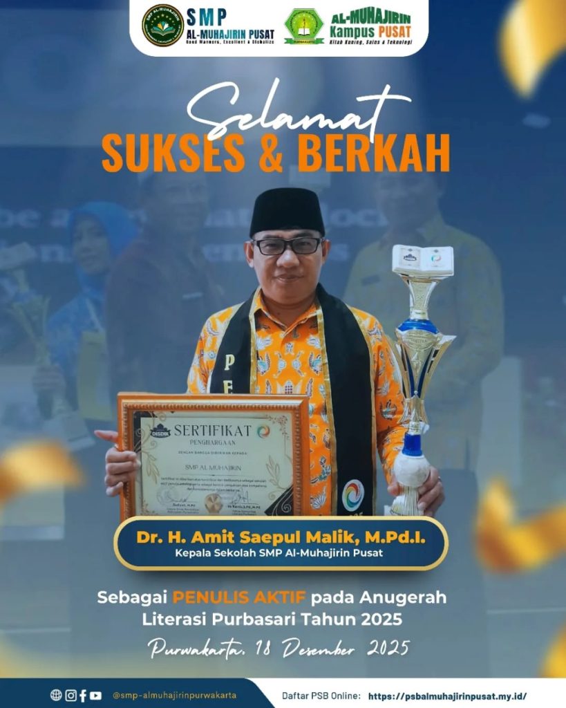 PURWAKARTA — Prestasi membanggakan kembali ditorehkan keluarga besar SMP Al-Muhajirin Pusat. Kepala sekolah, Dr. H. Amit Saepul Malik, M.Pd.I, meraih penghargaan sebagai Penulis Aktif pada ajang Anugerah Literasi Purbasari Tahun 2025, sebuah pengakuan atas dedikasi dan konsistensinya dalam menghidupkan budaya literasi di lingkungan pendidikan.
