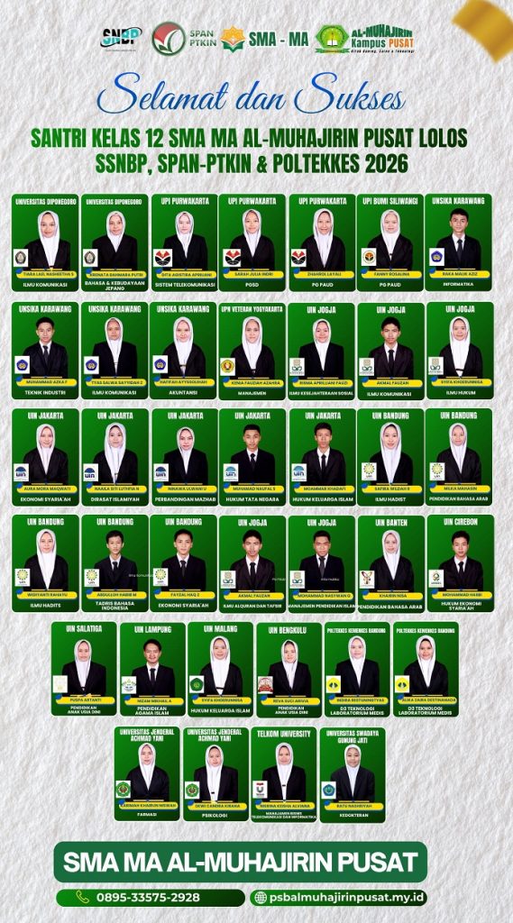 AL-MUHAJIRIN — Kabar membanggakan kembali datang dari keluarga besar SMA–MA Al-Muhajirin Pusat Purwakarta Jalan Veteran. Tahun 2026 menjadi momentum istimewa, ketika puluhan siswa-siswi berhasil menembus berbagai jalur seleksi perguruan tinggi negeri—mulai dari SPAN-PTKIN, SNBP, hingga SIPENMARU Poltekkes Kemenkes.