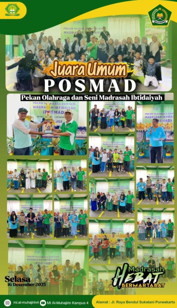 PURWAKARTA — Prestasi membanggakan kembali ditorehkan oleh MI Al-Muhajirin. Pada ajang Pekan Olahraga dan Seni Madrasah Ibtidaiyah (POSMAD) MI tingkat Kabupaten Purwakarta tahun 2025 yang diselenggarakan oleh KKMI Kabupaten Purwakarta, MI Al-Muhajirin berhasil keluar sebagai Juara Umum.