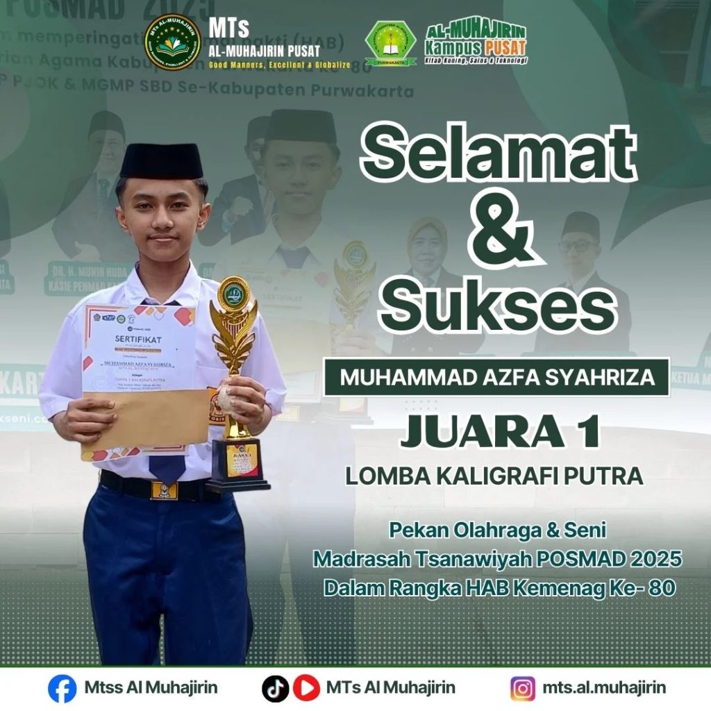 PURWAKARTA— Prestasi membanggakan kembali ditorehkan oleh siswa MTs Al-Muhajirin Pusat. Muhammad Azfa Syahriza berhasil meraih Juara 1 Lomba Kaligrafi Putra dalam ajang Pekan Olahraga dan Seni Madrasah (POSMAD) MTs Tahun 2025.