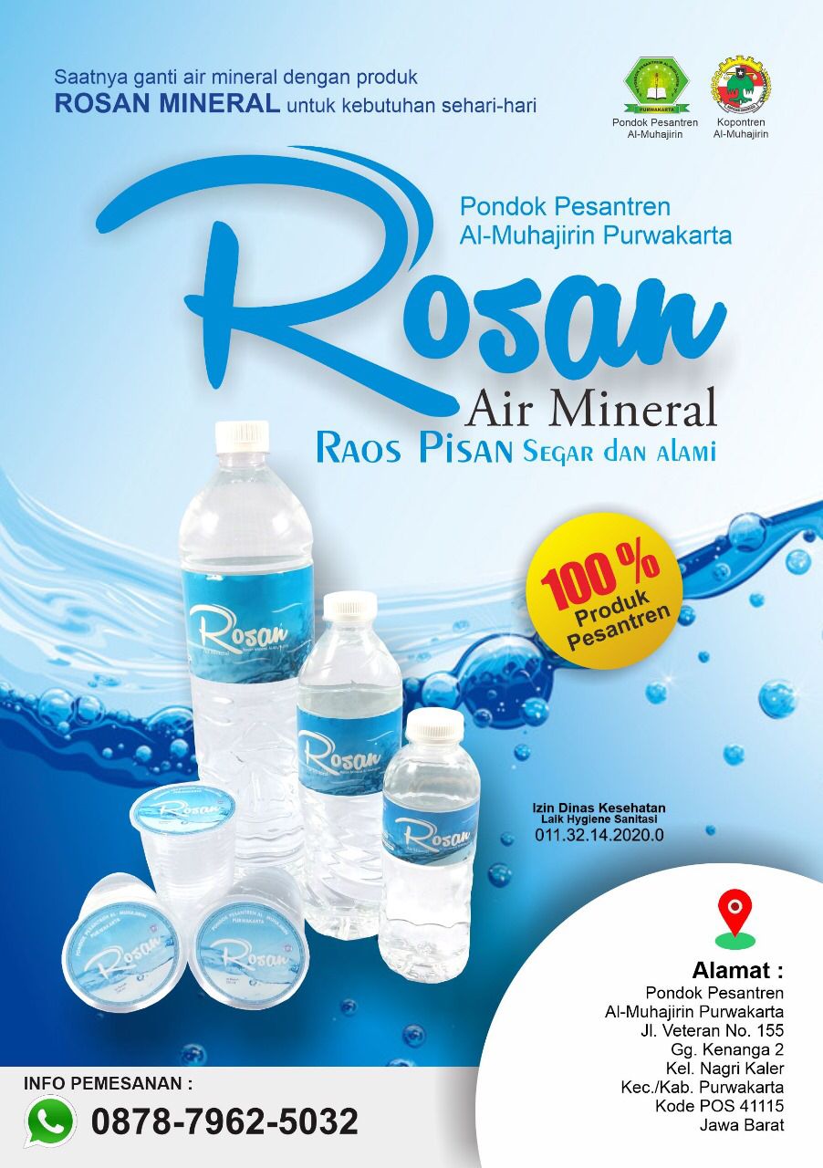 Rosan Mineral, air mineral produksi Pondok Pesantren Al-Muhajirin Purwakarta, menjadi solusi sehat, segar, dan bernilai ibadah bagi masyarakat. Dengan slogan khas “Raos Pisan, Segar dan Alami”, Rosan Mineral sudah mengantongi izin resmi dari BPOM RI (MD 265228008188 SM) serta Sertifikasi Halal dari MUI, menjadikannya pilihan aman dan terpercaya untuk dikonsumsi setiap hari. Raos Pisan, Segar dan Alami