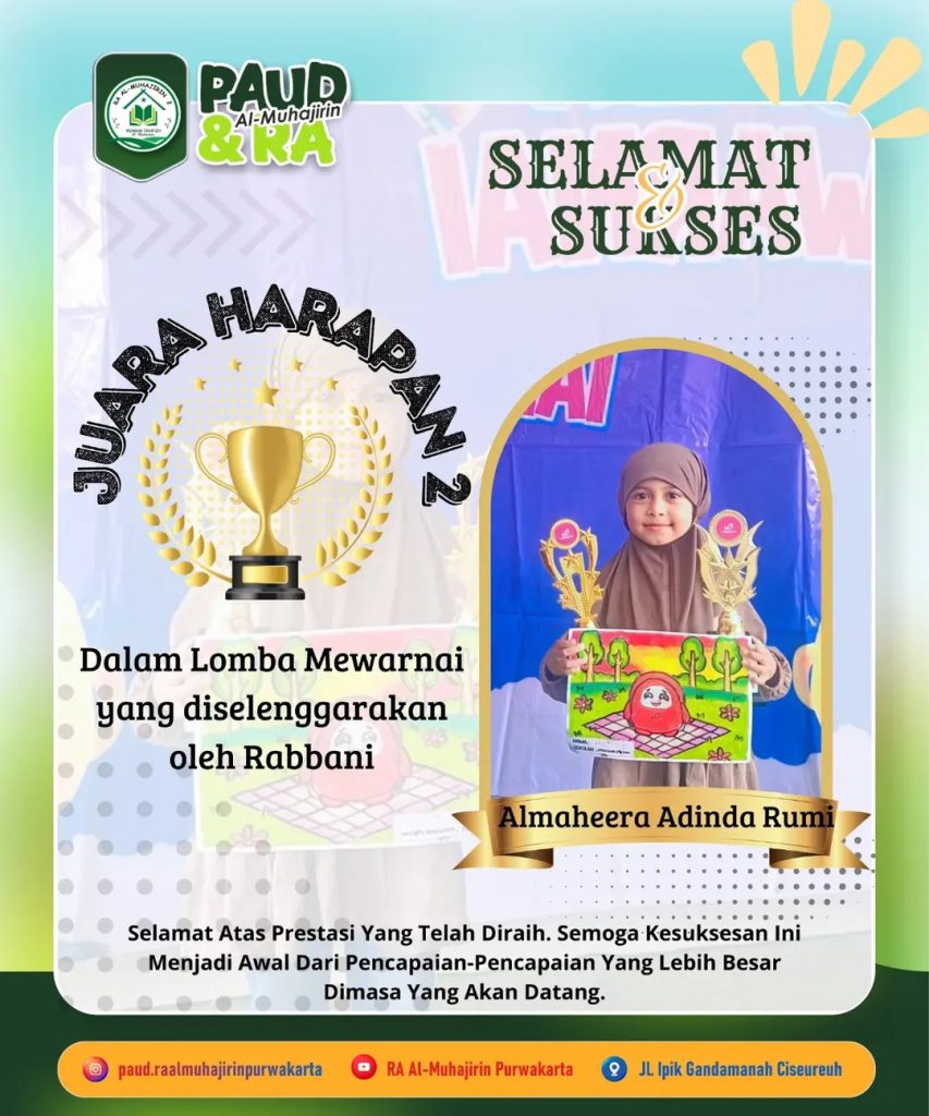 PURWAKARTA — Kabar membanggakan datang dari keluarga besar PAUD RA Al-Muhajirin Purwakarta. Salah satu peserta didiknya, Almaheera Adinda Rumi, berhasil meraih Juara Harapan 2 dalam Lomba Mewarnai yang diselenggarakan oleh Rabbani.