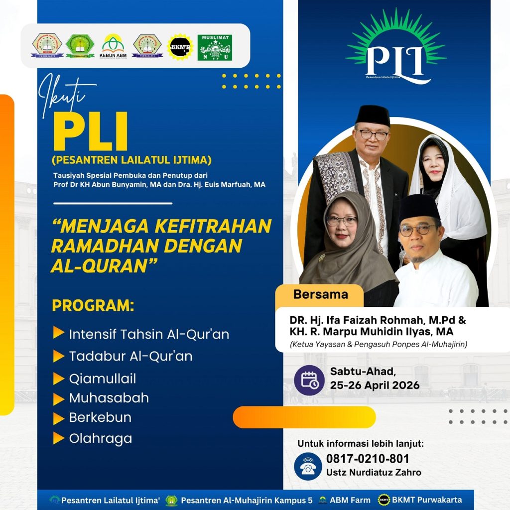 Pondok Pesantren Al-Muhajirin menggelar Pesantren Lailatul Ijtima (PLI), sebuah program pembinaan ruhani yang diikuti para jamaah. Kegiatan ini resmi dibuka oleh Ketua Yayasan Al-Muhajirin, Dr. Hj. Ifa Faizah Rohmah, M.Pd, dengan penuh kehangatan dan harapan.