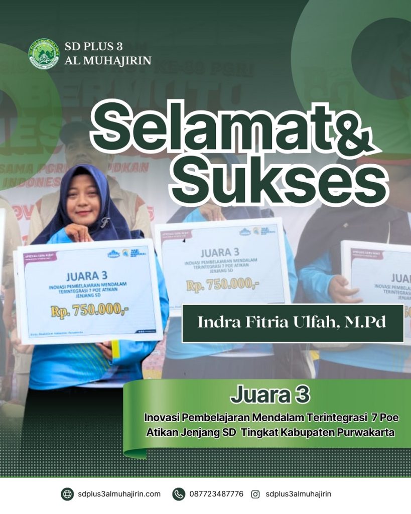 PURWAKARTA — Kabar membanggakan datang dari keluarga besar SD Plus 3 Al-Muhajirin Purwakarta. Salah satu pendidik terbaiknya, Ibu Indra Fitria Ulfah, M.Pd, berhasil meraih gelar Juara 3 dalam Lomba Inovasi Pembelajaran Mendalam (Deep Learning) Terintegrasi 7 Poe Atikan Tingkat Kabupaten Purwakarta.