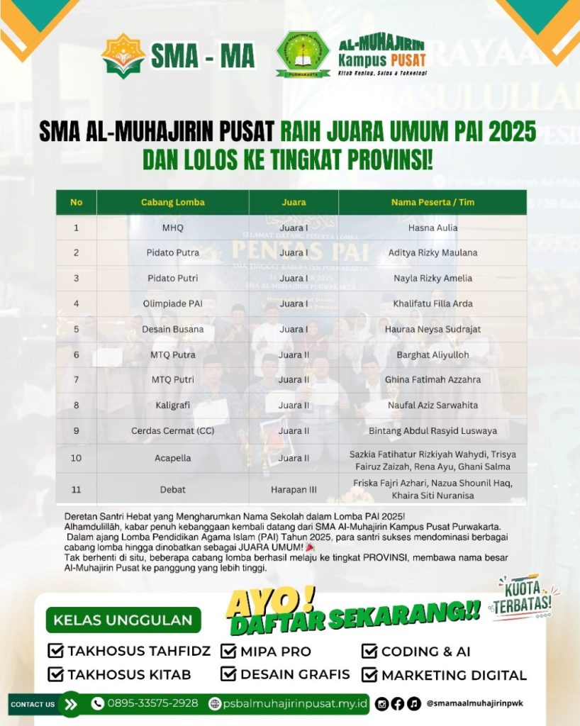 Dengan torehan lima gelar Juara I, empat Juara II, dan satu Harapan III, SMA Al-Muhajirin Pusat dinobatkan sebagai Juara Umum Pentas PAI 2025 dan pada sejumlah cabang perlombaan mewakili Kabupaten Purwakarta di tingkat Provinsi Jawa Barat.