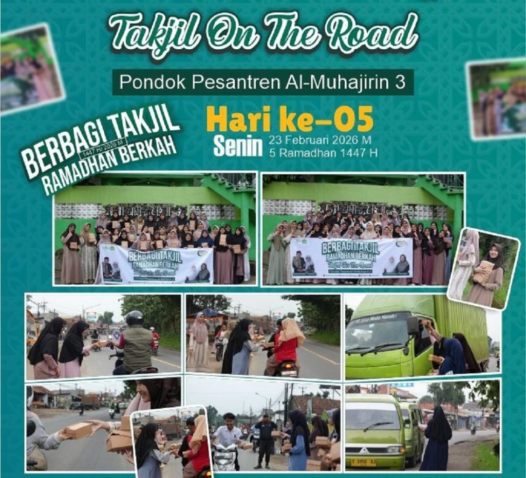 AL-MUHAJIRIN- Memasuki hari ke-5 Ramadhan 1447 Hijriah, Pondok Pesantren Al-Muhajirin 3 kembali menggelar kegiatan “Takjil On The Road”, Senin (23/2/2026). Kegiatan ini merupakan bagian dari rangkaian berbagi takjil yang rutin dilaksanakan setiap bulan suci, sebagai wujud kepedulian dan upaya menebar kebaikan kepada masyarakat.