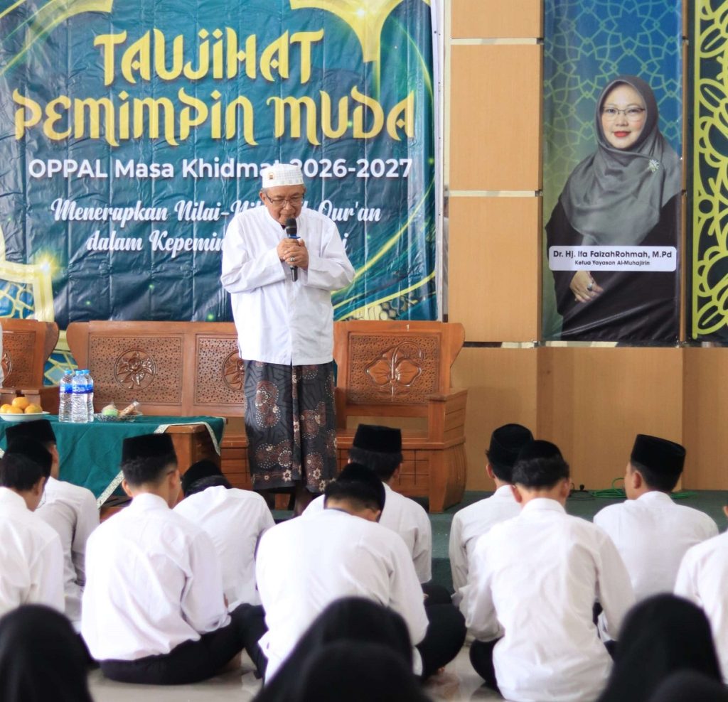 AL-MUHAJIRIN— Kegiatan Taujihat Pemimpin Muda OPPAL (Organisasi Pelajar Pesantren Al-Muhajirin) Kampus Pusat Masa Khidmat 2026–2027 digelar di Aula Syaikh Datul Kahfi (SDK) Kampus Pusat Pondok Pesantren Al-Muhajirin Purwakarta, Jumat 13 Februari 2026. Kegiatan ini mengusung tema penerapan nilai-nilai Al-Qur’an dalam kepemimpinan santri sebagai fondasi utama dalam menjalankan amanah organisasi.