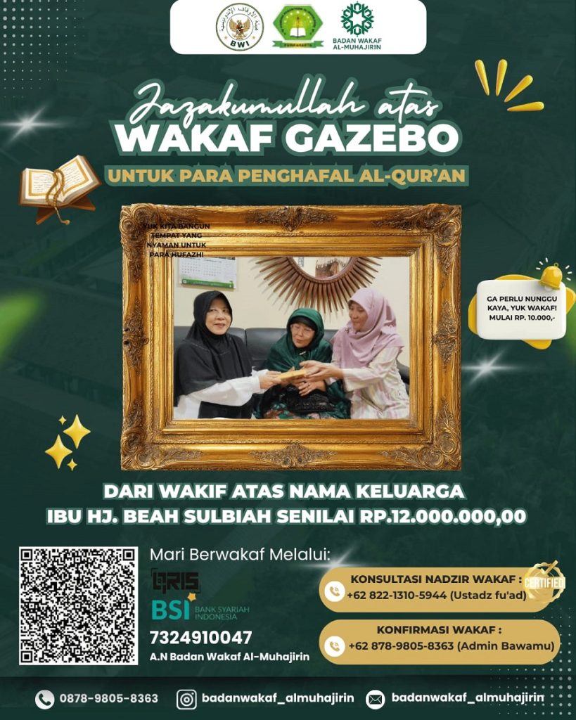 ALMUHAJIRIN — Gerakan wakaf yang digagas Badan Wakaf Al-Muhajirin terus menunjukkan geliat positif. Salah satunya melalui Program Wakaf Gazebo Tahfidz yang diperuntukkan bagi para santri penghafal Al-Qur’an. Terbaru, kontribusi datang dari keluarga Ibu Hj. Beah Sulbiah dengan nilai wakaf sebesar Rp12.000.000.